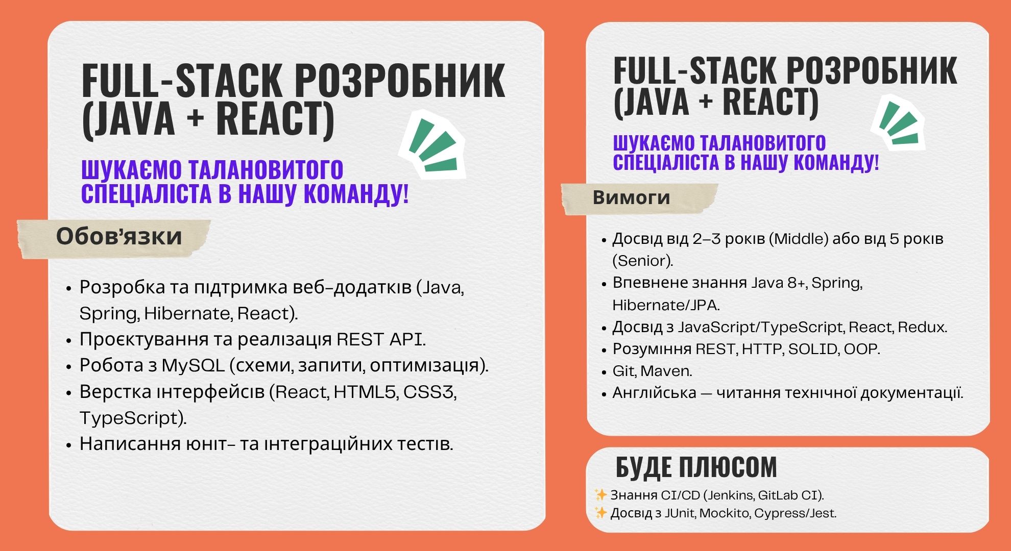 Обов’язки, вимоги, буде плюсом